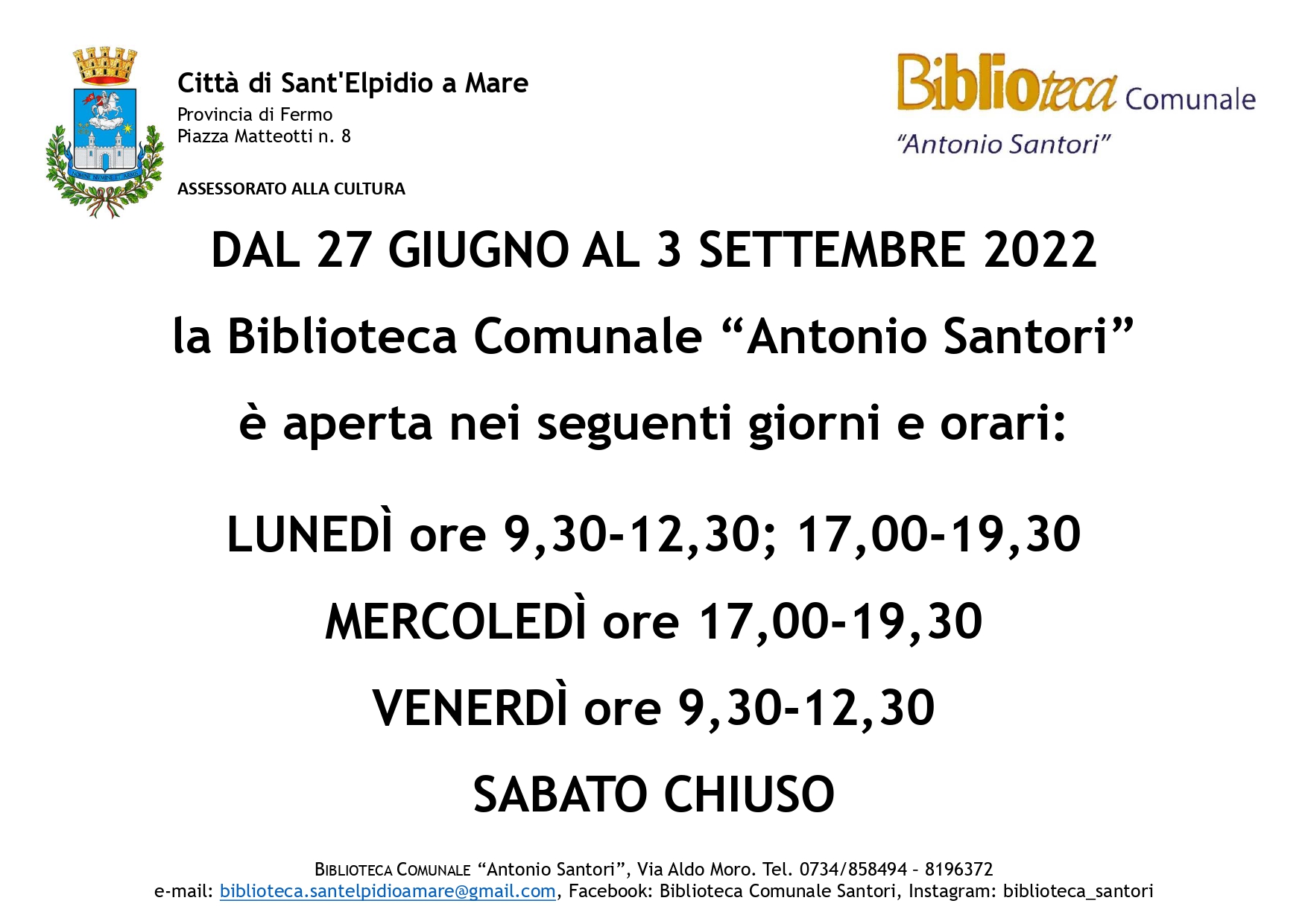 AVVISO SANT'ELPIDIO A MARE 07.04.2014 - Si comunica che, per motivi di servizio, il servizio di Archivio Storico è momentaneamente sospeso, fino a diversa comunicazione. La Biblioteca Comunale, invece, sarà aperta il lunedì, martedì, mercoledì dalle 15.30 alle 19.30, il giovedì dalle 9 alle 13.30 e dalle 15.30 alle 19.30, il venerdì dalle 9 alle 13.30....