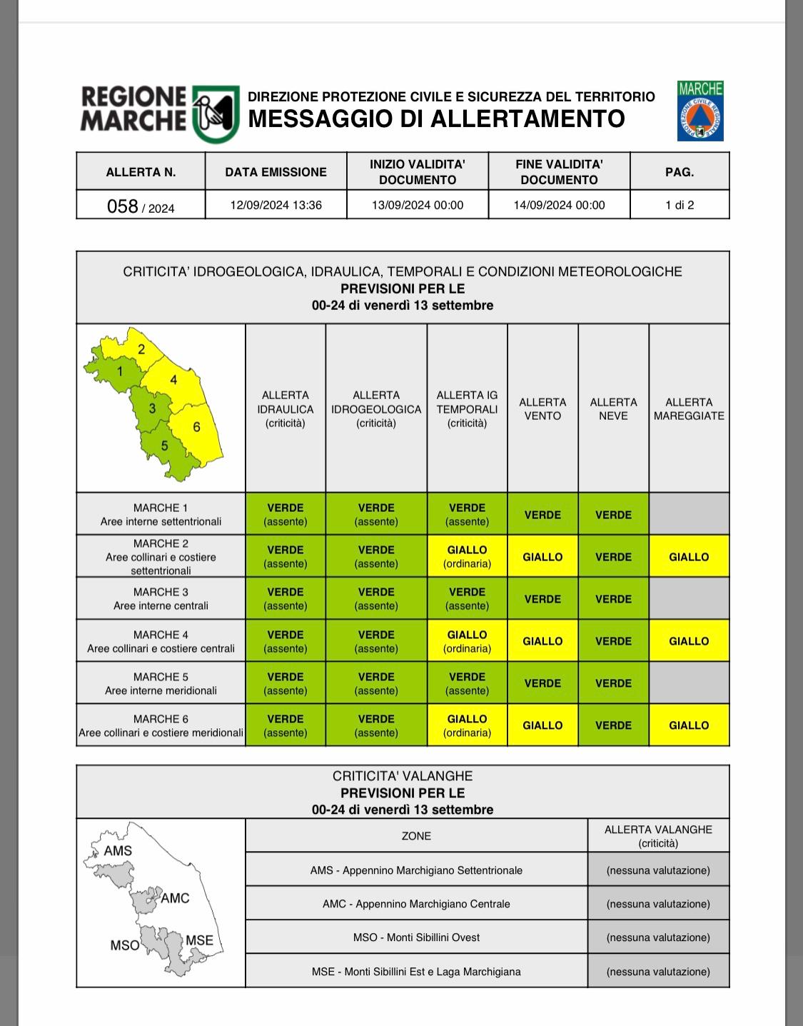 Si comunica che è stato emesso avviso di allertamento meteo n.58/2024 del 12/09/2024 per temporali e vento, criticità gialla, valido dalle 00:00 alle 24:00 del 13 settembre 2024 ed avviso di allertamento meteo n.59/2024 del 13/09/2024, criticità gialla, per vento valido dalle 00:00 alle 24:00 del 14 settembre 2024. Dettagli in allegato.